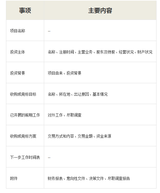 2016年12月5日,国家发改委下发《关于调整境外收购或竞标项目信息报告报送格式的通知》(发改办外资[2016]2613号),该通知规定,自12月5日起境内企业境外收购的信息报告需按照新的报告格式进行上报。新的报告格式的内容摘要如下: