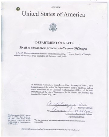 (一)文书已经美国国务院或州务卿(Secretary of the State)认证办公室认证;